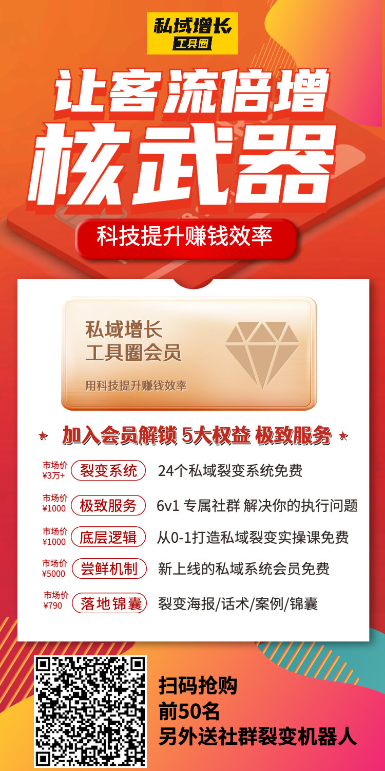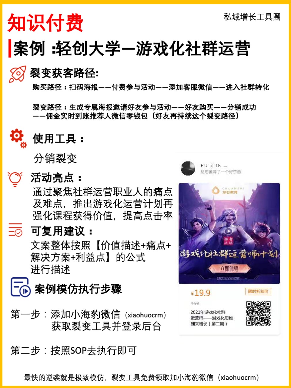 【分销裂变】知识付费 【轻创大学—游戏化社群运营】营销获客玩法 admin | 2022年2月22日 | 知识付费行业获客案例拆解 案例名:轻创大学—游戏化社群运营 01获取工具 添加小海豹微信,领取裂变工具,并激活; 02按照SOP文档去执行 加入【私域增长工具圈】解锁24个+裂变工具,免费获取裂变活动SOP文档、130个+营销锦囊、工具使用帮助! 点我查看【私域增长工具圈】介绍 扫码浏览案例: 03加入私域增长工具圈 分销